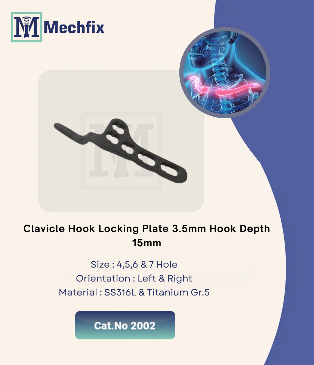 The Clavicle Hook Locking Plate 3.5mm with 15mm Hook Depth is specifically designed for lateral clavicle fractures and acromioclavicular joint injuries, providing superior stability and anatomical fixation. Its precisely engineered hook allows secure engagement of the acromion while minimizing soft tissue irritation.