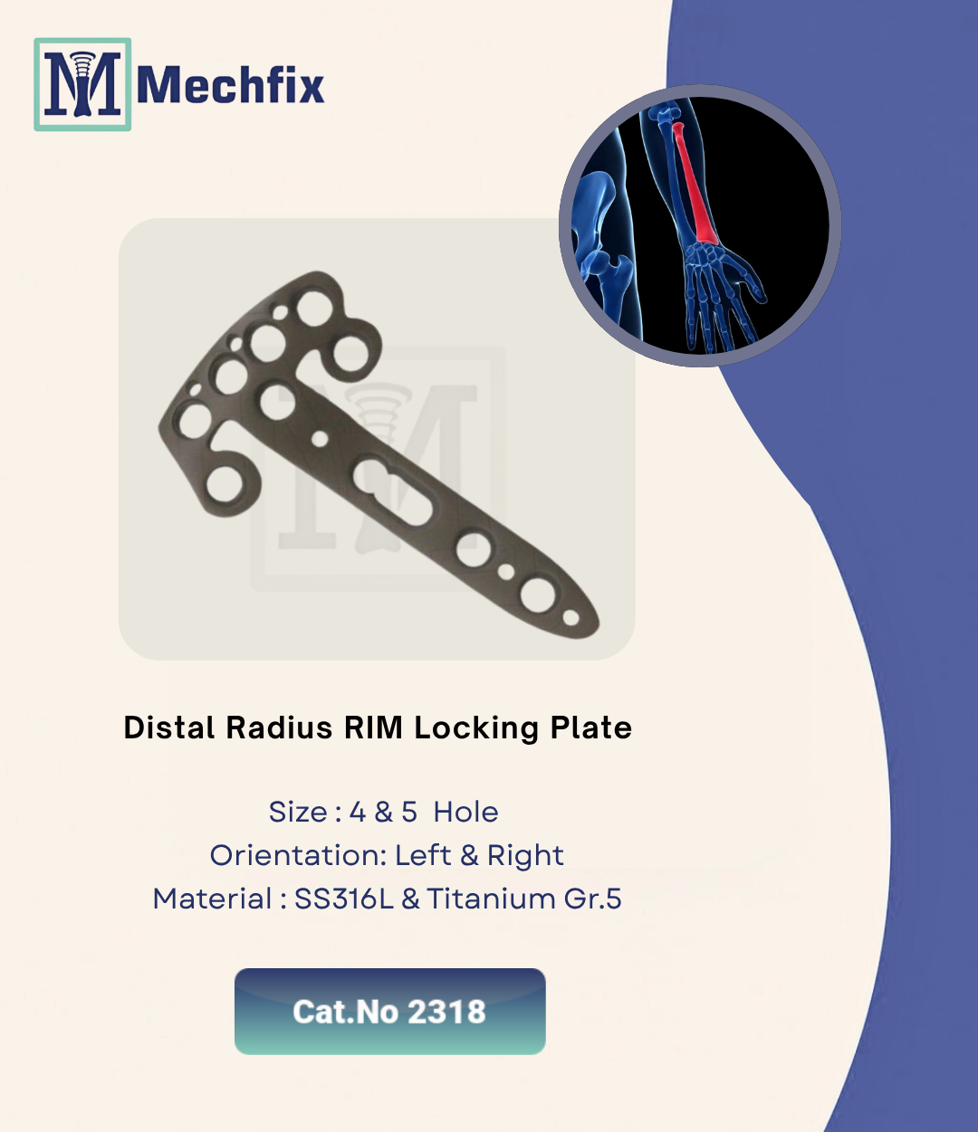The Distal Radius RIM Locking Plate is a state-of-the-art orthopedic implant designed for the secure stabilization and fixation of distal radius fractures, particularly in complex or unstable cases. Featuring a unique RIM (Radius Internal Mechanism) design, this plate provides an innovative solution for fracture fixation with an emphasis on anatomical precision, enhanced stability, and reliable mechanical support during the healing process. The locking screw system ensures robust fixation, making it an ideal choice for both simple and comminuted fractures of the distal radius, including those with osteoporotic bone.